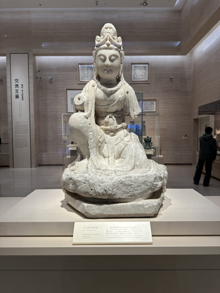 唐(公元618-907年)这尊菩萨像是主尊佛像和众胁侍组像中的一件,即位于佛下方的供养菩萨。此像源自玄宗时期的长安,以大理石的细腻材质,充分展示肌肤柔软弹性的质感,是盛唐白石造像的上乘之作。